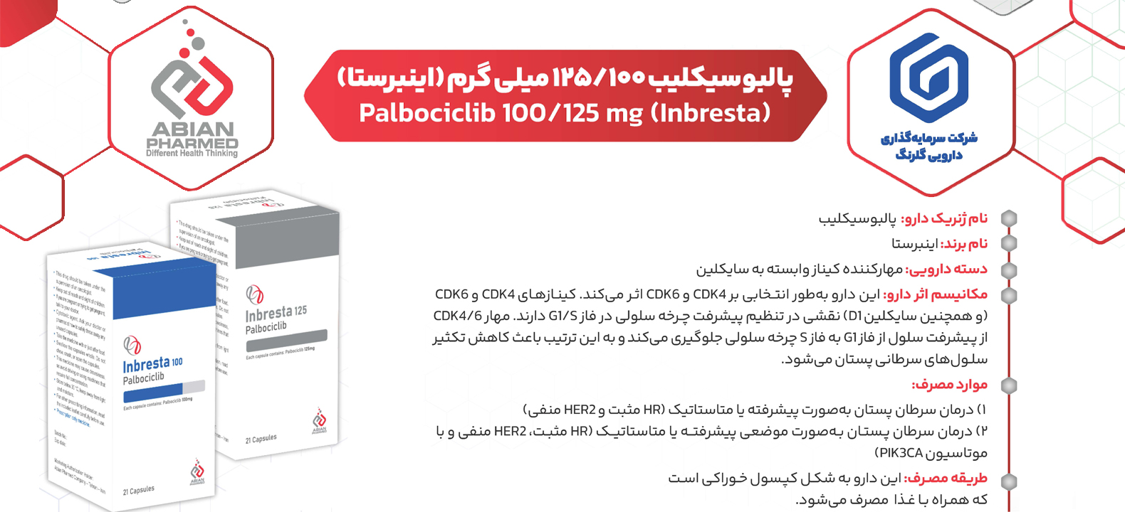 در ادامه، مدیرعامل گروه دارویی توضیح داد: “محصول دیگر گروه، البوسیکلیب ۱۰۰/۱۲۵ میلیگرم با نام ژنریک پالبوسیکلیب است که توسط شرکت دانشبنیان ابیان فارمد تولید میشود.”